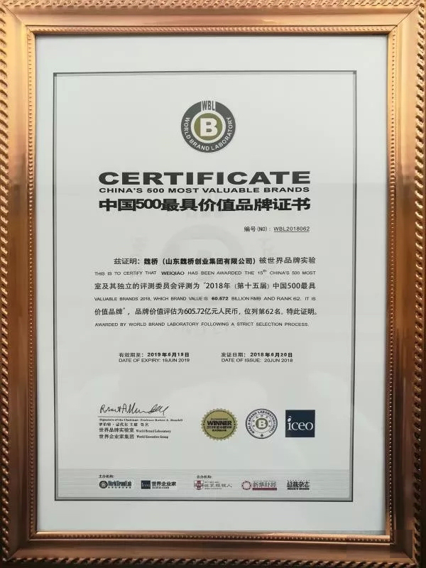 6月20日,由世界品牌實驗室主辦的第十五屆“世界品牌大會”發(fā)布了2018年《中國500最具價值品牌》分析報告,“魏橋”品牌價值605.72億元,比2017年增長87.57億元,增幅近17%。這也是自2004年世界品牌實驗室首次發(fā)布《中國500最具價值品牌》報告以來,魏橋連續(xù)第15年上榜。